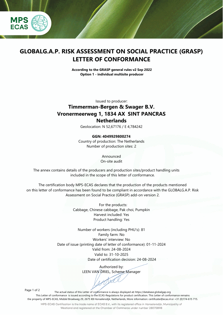 Door onze sterke spitskoolrassen leveren we daadwerkelijk altijd dezelfde kwaliteit. Het hele jaar door krijgt u bij ons de lekkerste spitskool. Door samenwerking met de beste veredelaars worden de rassen die wij verbouwen steeds beter, smakelijker en sterker. Dat is ook nodig in een wereld waarin het klimaat steeds onvoorspelbaarder wordt. De kwaliteit die we leveren wordt gewaarborgd met verschillende certificeringen (GLOBAL GAP, PlanetProof, QS Qualität und Sicherheit GmbH*, SKAL Bio Controle).